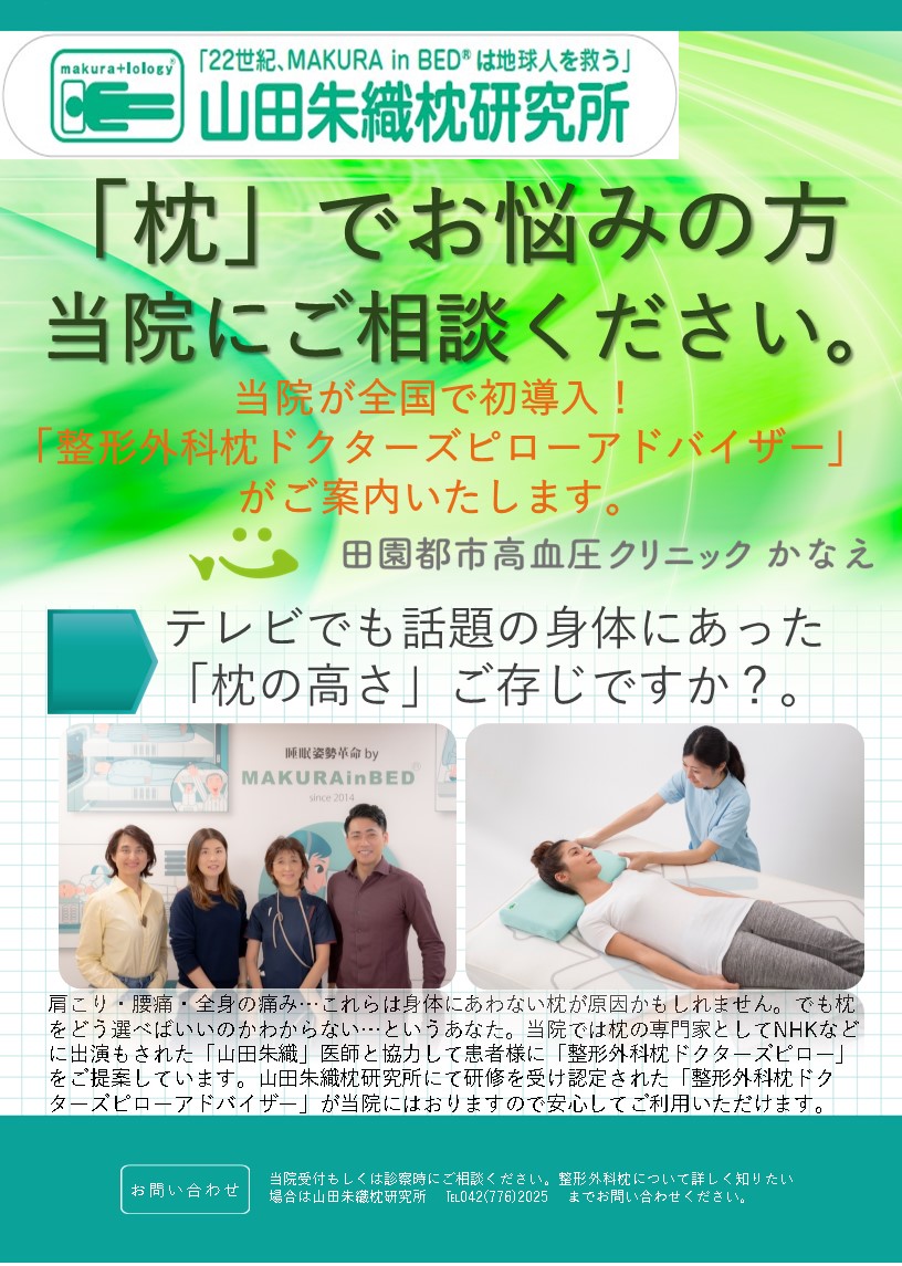 サイズはとても大切です。あなたが自分の枕のサイズを知らないのは、アスリートが靴のサイズを知らずに試合に臨むのと同じです。自己流の洋服のサイズで着ているビジネススーツのようなものです。サイズをしっかり測定して、サイズに合ったスーツを着れば誰でもかっこいいのです。枕も同じです。あなたの枕のサイズ(cm)を知らずに、どうやって首や肩を休めるのでしょうか? まくらは平均4年使われているといいます。睡眠中、あなたの首をささえるのは枕なのです。医者さんが作った枕ドクターズピローの購入が可能です。田園都市高血圧クリニックのまくら外来のご予約をお待ちしております。