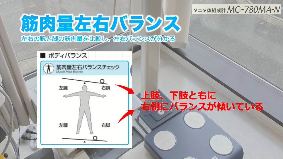 写真の例は、上肢下肢ともに右型の筋肉量が多くバランスが右に傾いている例です。