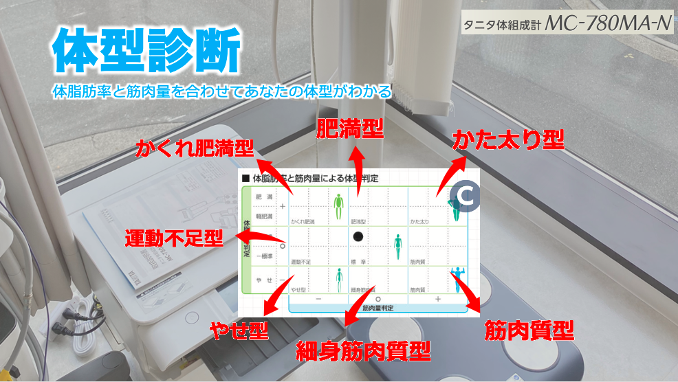 脂肪と筋肉量から体型を8種類に分けて体型診断をします。