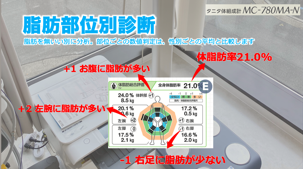 しかしながら、体組成計(TANITA MC-780MA-N)を用いると全体の体脂肪率だけでなく、部位別に脂肪を診断ができます。