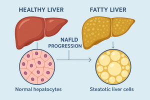 脂肪肝の中には、ほとんど進行しないタイプもありますが、炎症を伴い進行するタイプでは、肝硬変や肝がんにつながることがあります。